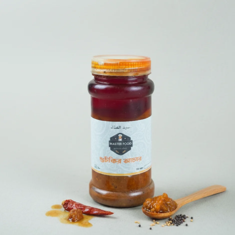 শুটকির আচার স্বাদে ঝাল ও সুগন্ধে ভরপুর, যা ভাতের সঙ্গে অতুলনীয় লাগে। এটি খাবারে ভিন্নমাত্রার স্বাদ যোগ করে এবং রুচি বাড়াতে দারুণ সহায়ক।